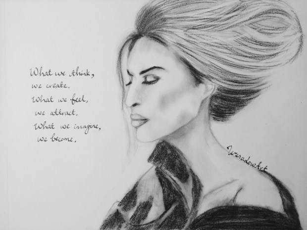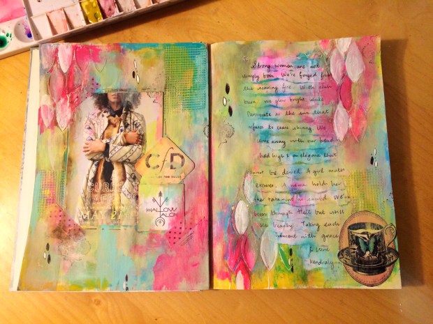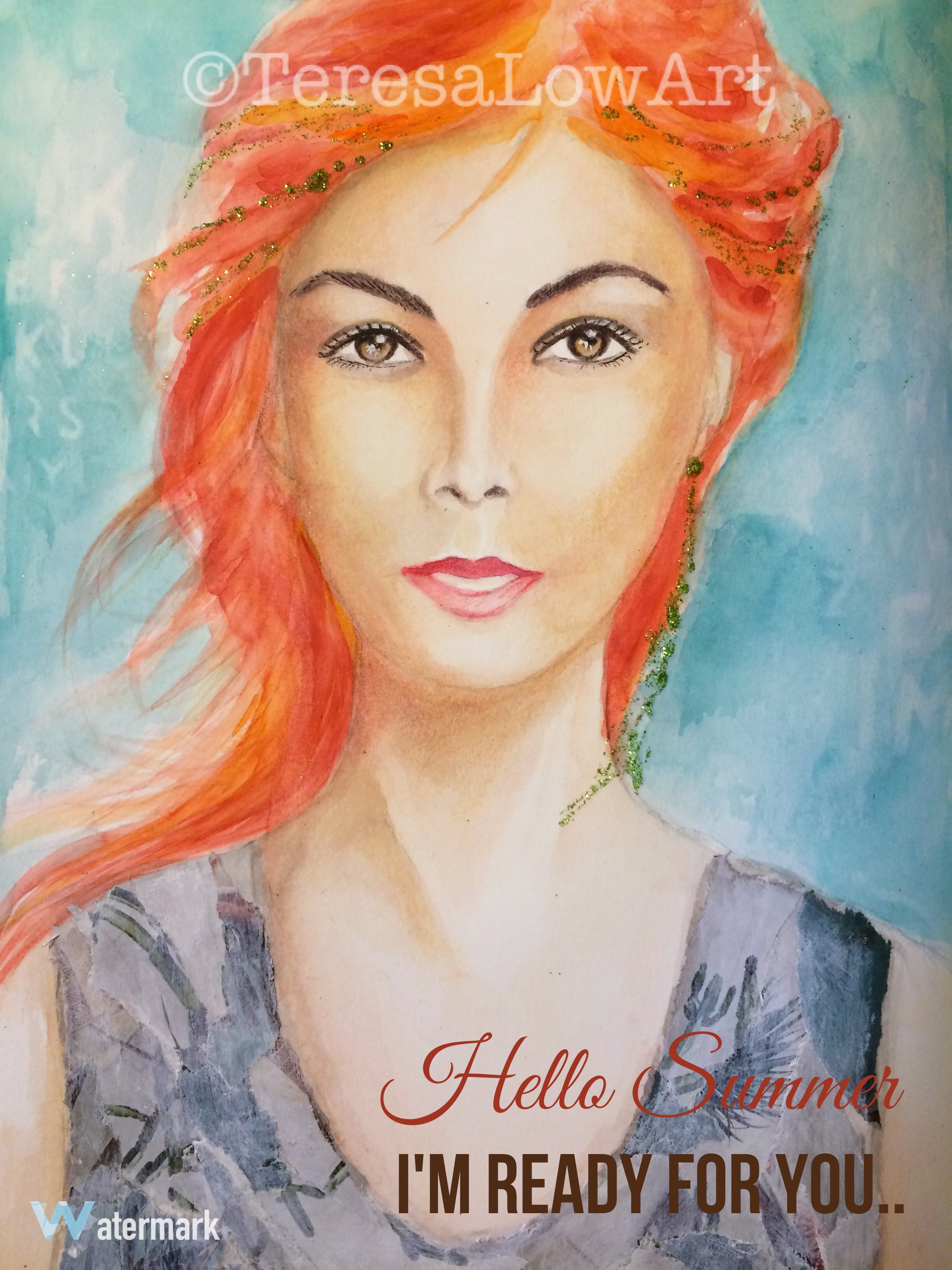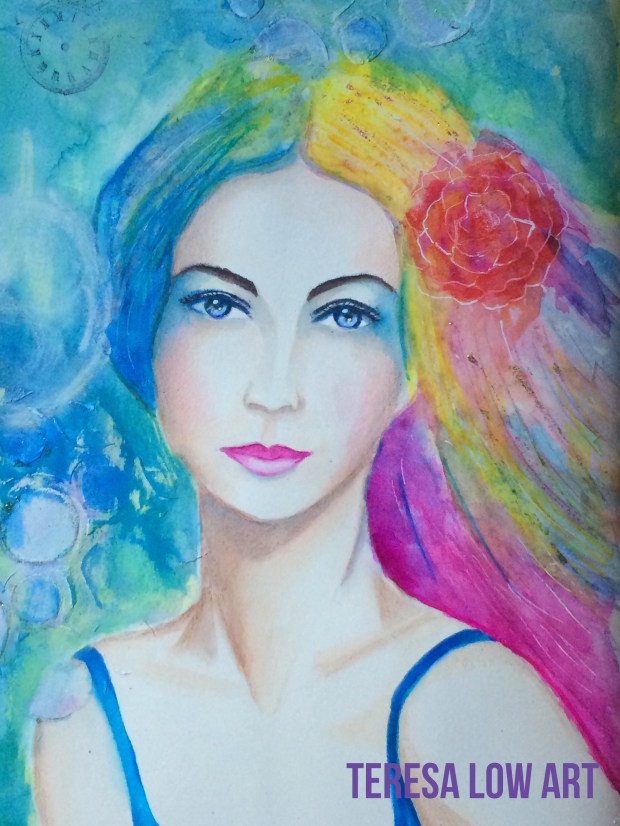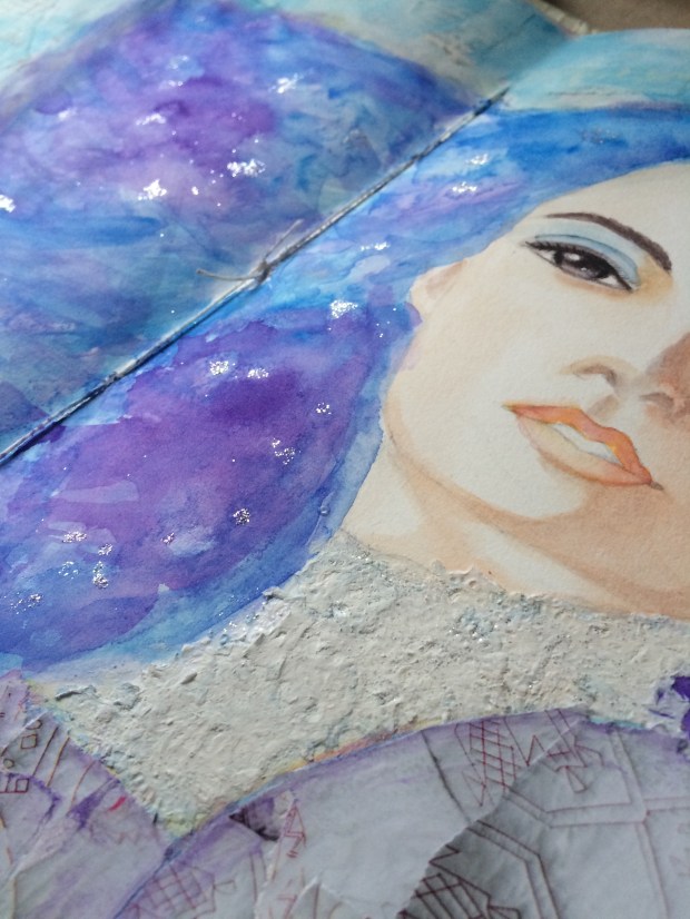 Finished her today.She is done. Had so much fun playing with her big crazy hair. Had to tone it down a bit 😉Also struggled with her top, painted with different colors and finally decided to go with collage. I like how it turned out.