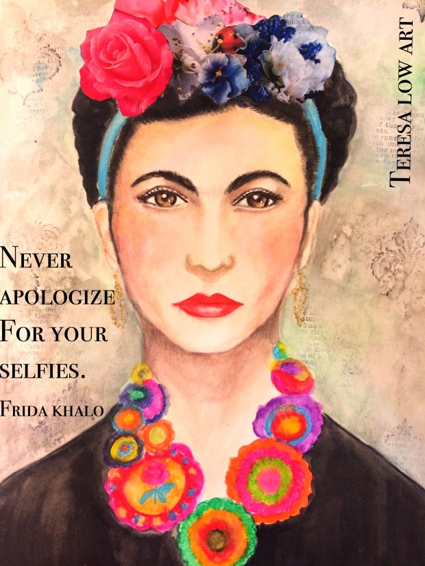 Never apologize for your selfie May 1, 2016 Frida Khalo is a fascinating artist. She once said that she was her own muse as she spent a lot of much by herself and would know the subject next. Guess that makes her a pioneer in the use of selfie?😀 watercolor, collage and stamps. Share this:Tweet Click to email a link to a friend (Opens in new window) Email Like Loading...