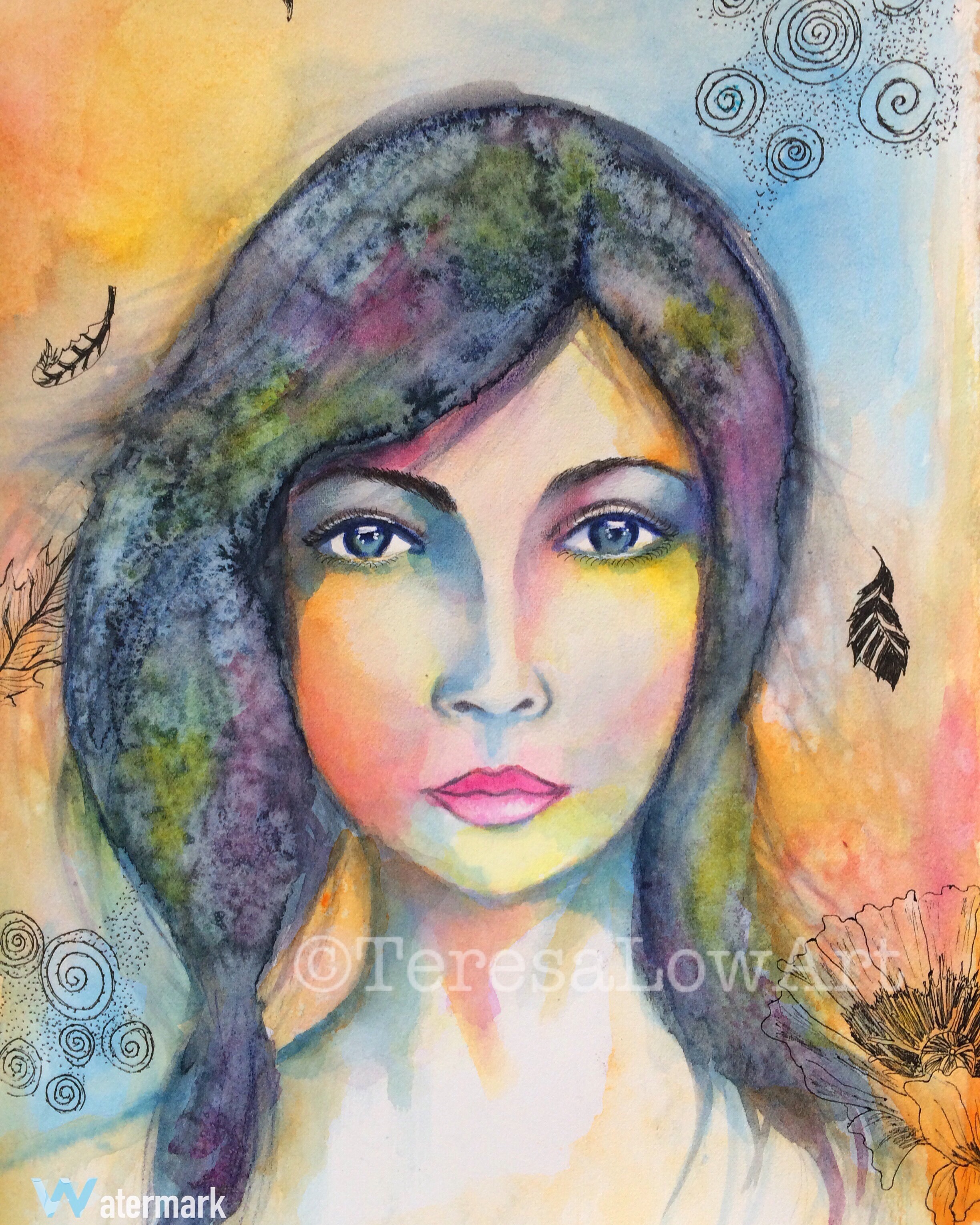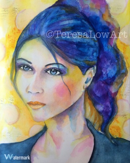 Painting on a beautiful Saturday pm. Continuing my experiment with non skin tone colors on her face. This time I also added some ink drawing on the background. The stipple technique did not quite work out, but that’s ok. I like her. Playing with non skin tone colors is tricky. It’s like a trial and error. A gamble. I like what turned up.