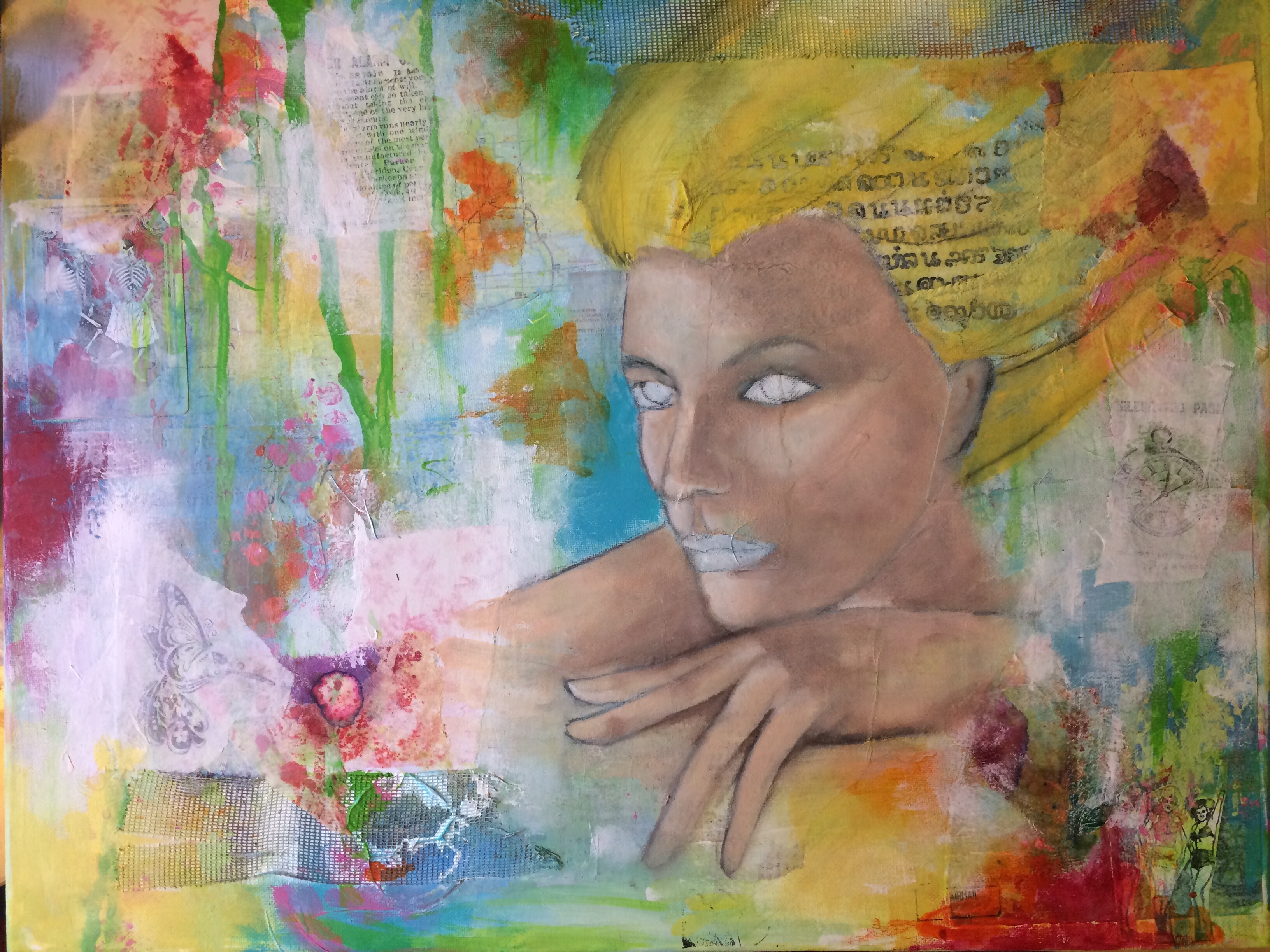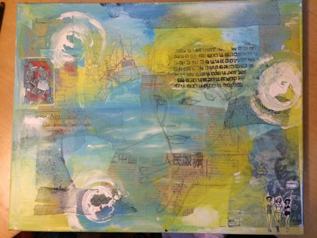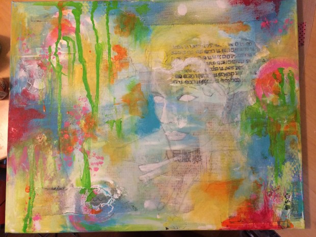 I did not have a plan. Just wanted to play. So I slapped on some acrylic paint, added some collage, more paint, then added a face.
