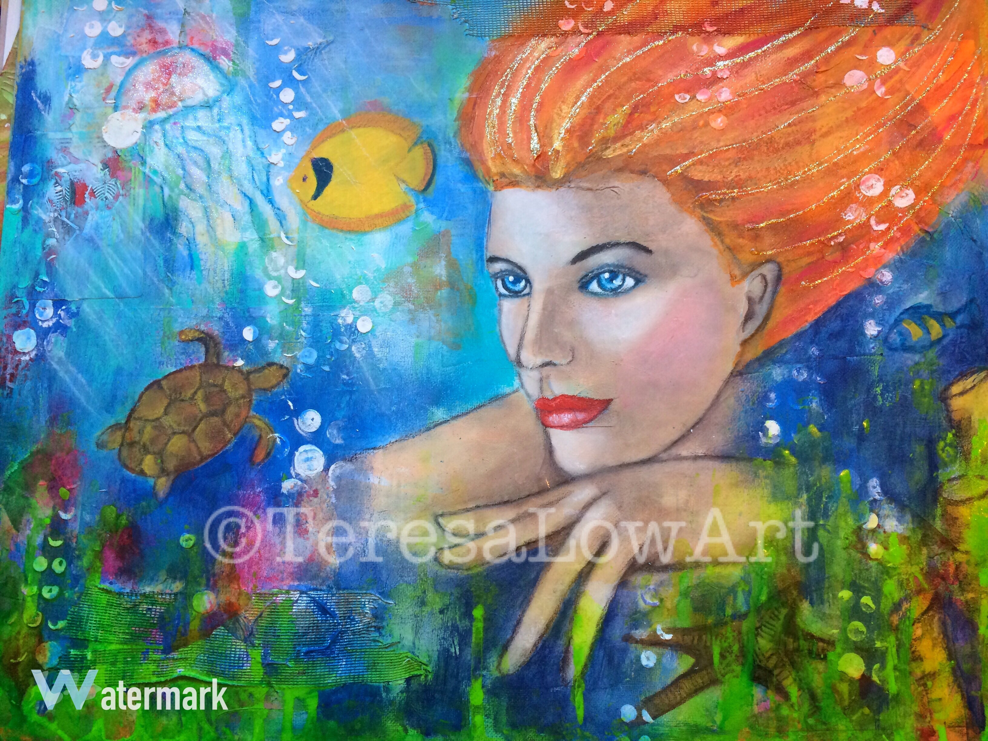 Came home and played with it this morning. Added darker tones, glitter to her hair, glitter to the jelly fish, molding paste for the bubbles and pastels on her face. I can probably work on this forever (I probably will). But for now, I am happy with her. Will hang it up in my bedroom. I love everything about the sea..