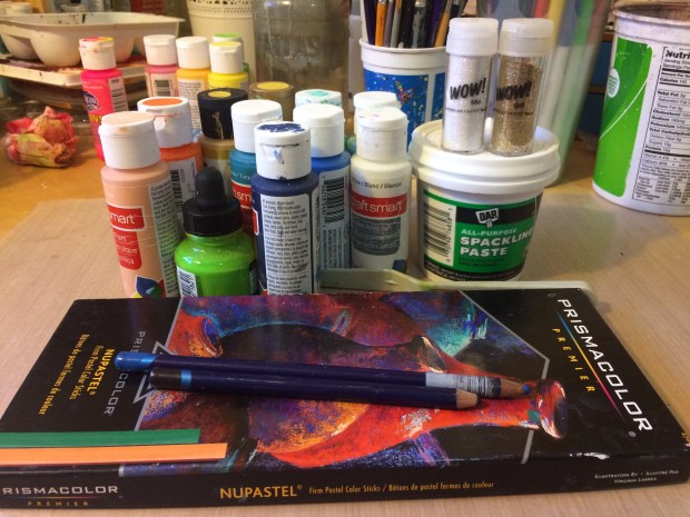 I used all kinds of supplies for this. Acrylic paint, watercolor pencils, pastels, acrylic ink, glitter, spackling paste, scrap paper…love mixed media!