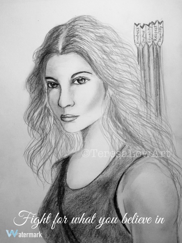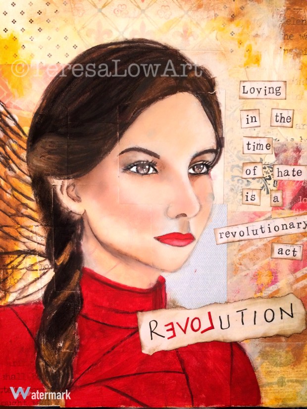 Hence I painted her, using Katniss from hunger games as my muse, added love wings on her back and a quote I found “Loving in the time of hate is a revolutionary act”.