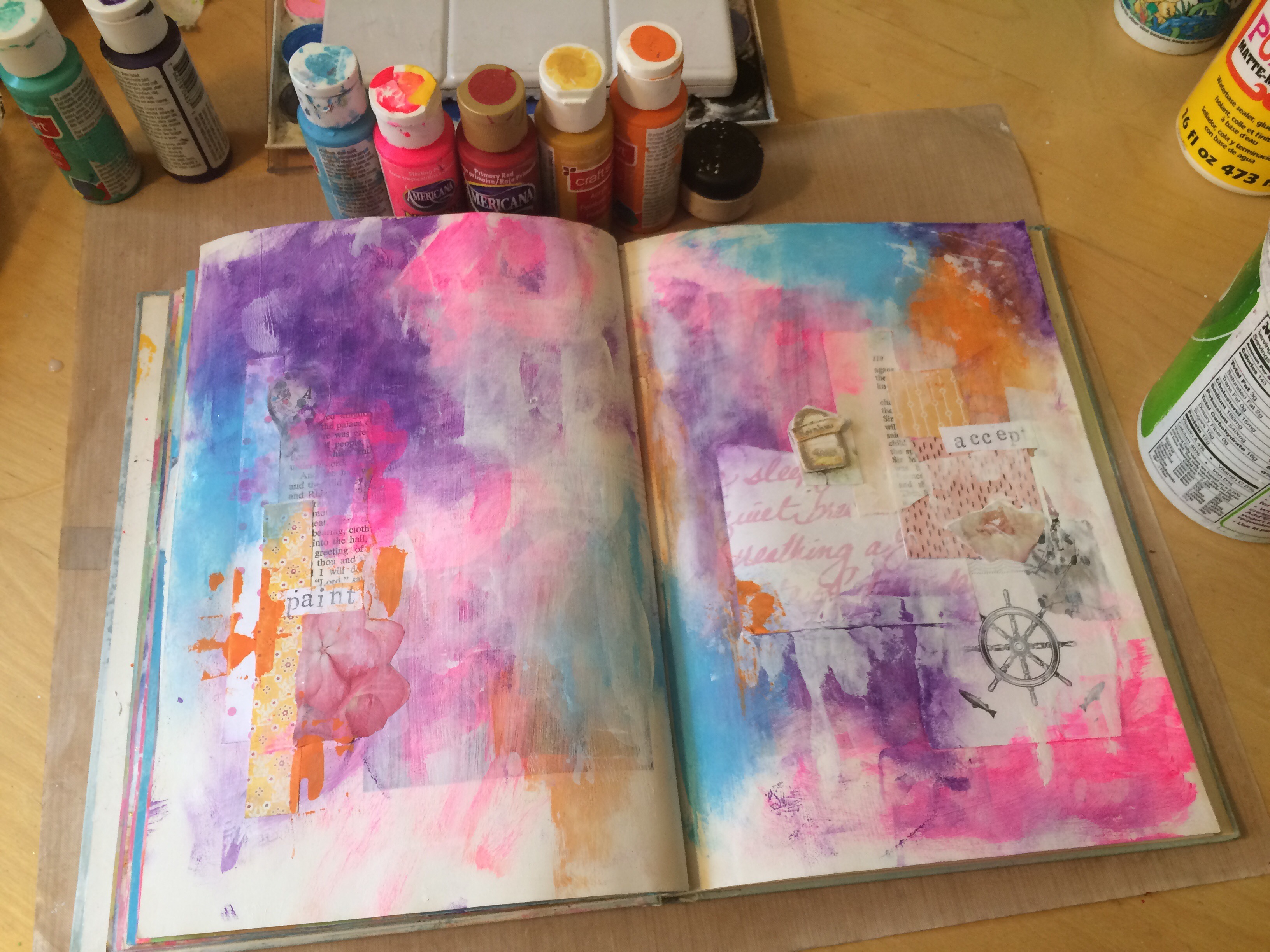 This is a 2 page spread. I started with slapping some acrylic paint on my book.