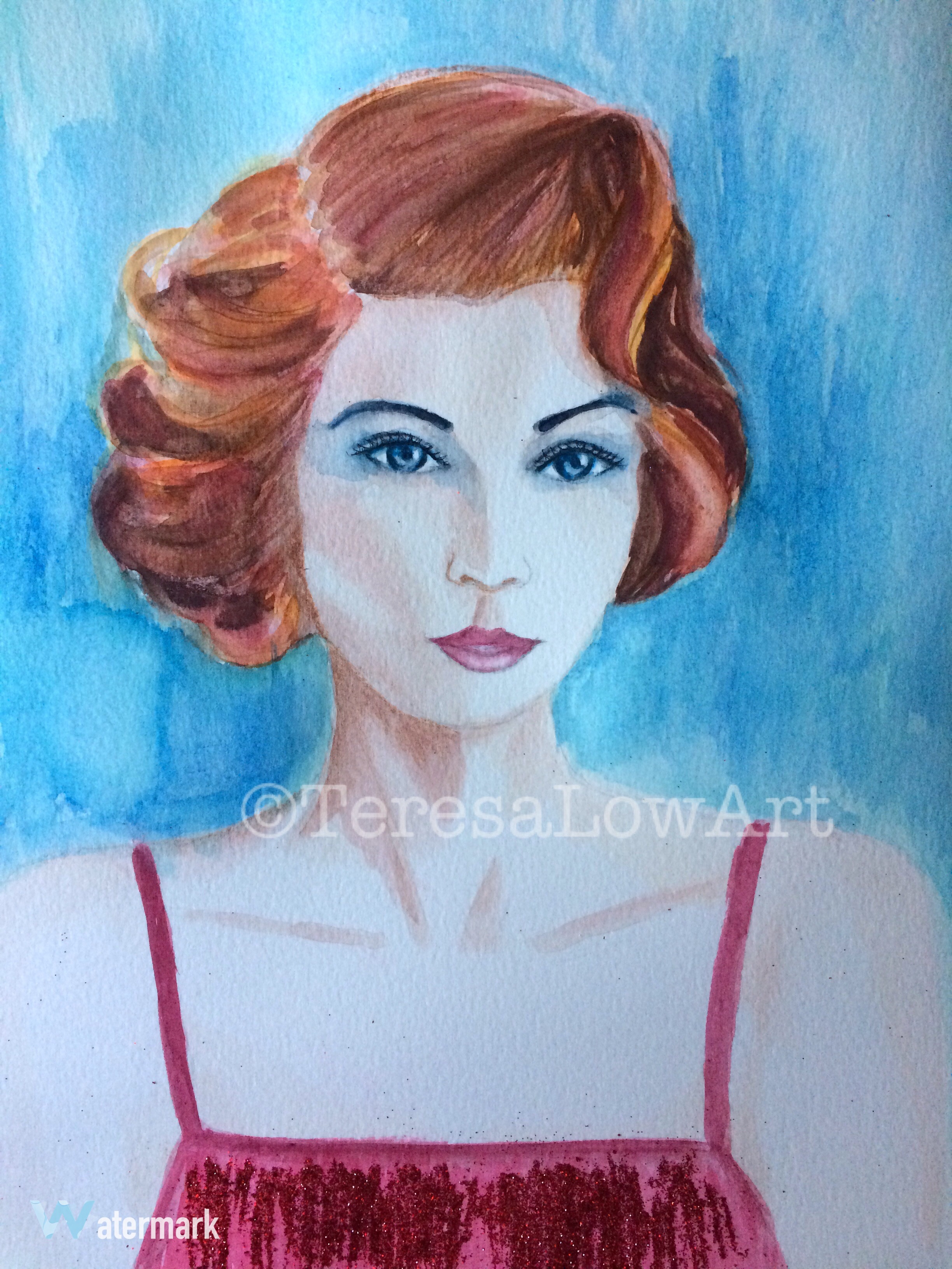 Watercolor painting with collage for her dress. I used gouache for the red background as I wanted it to be a little opaque and very vibrant. Love the effect.