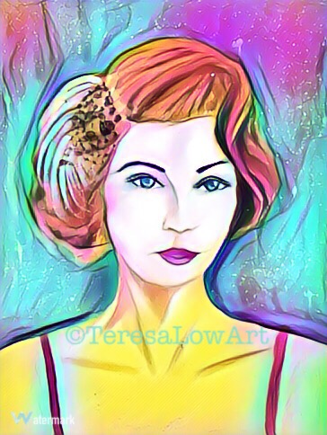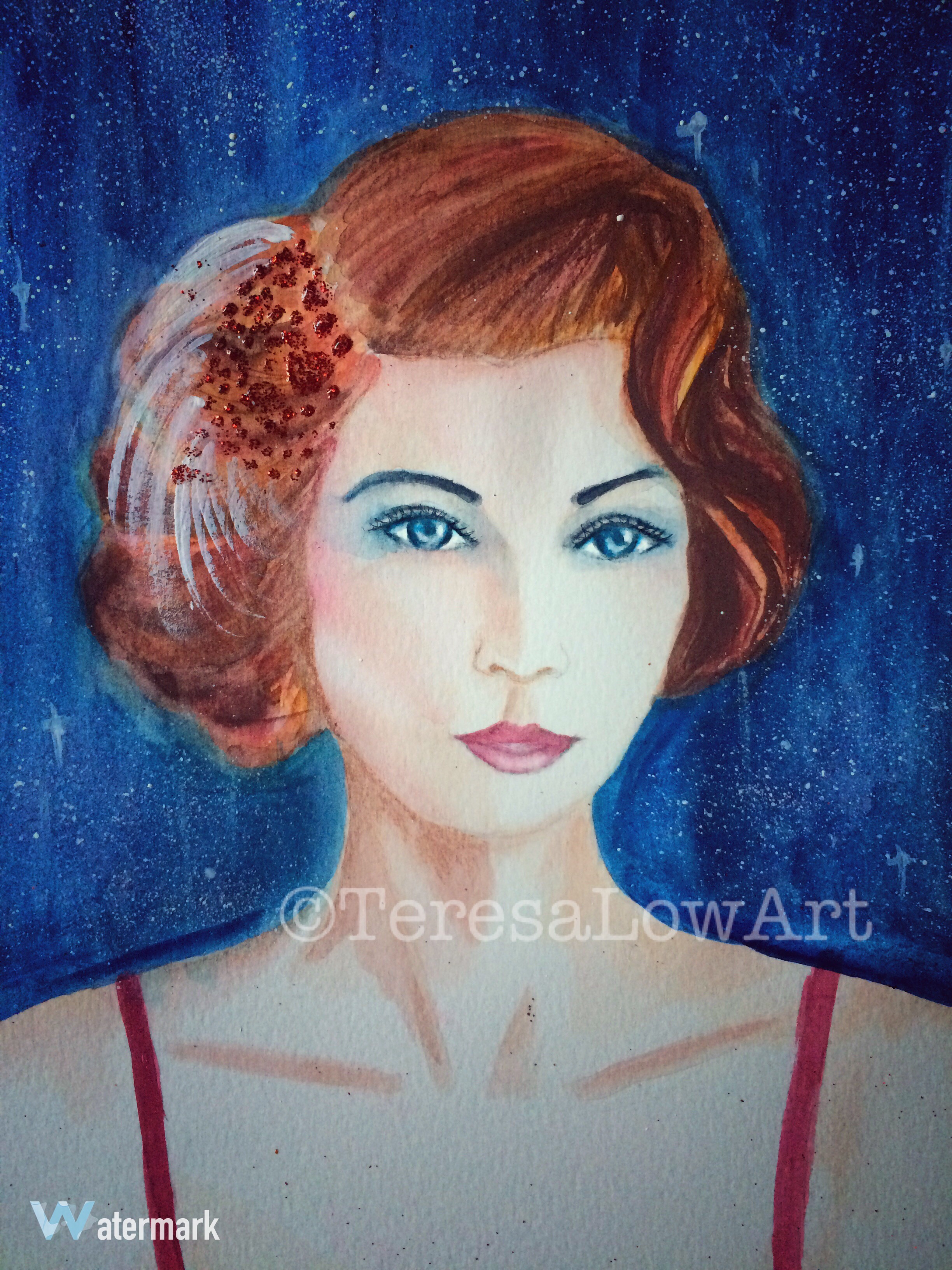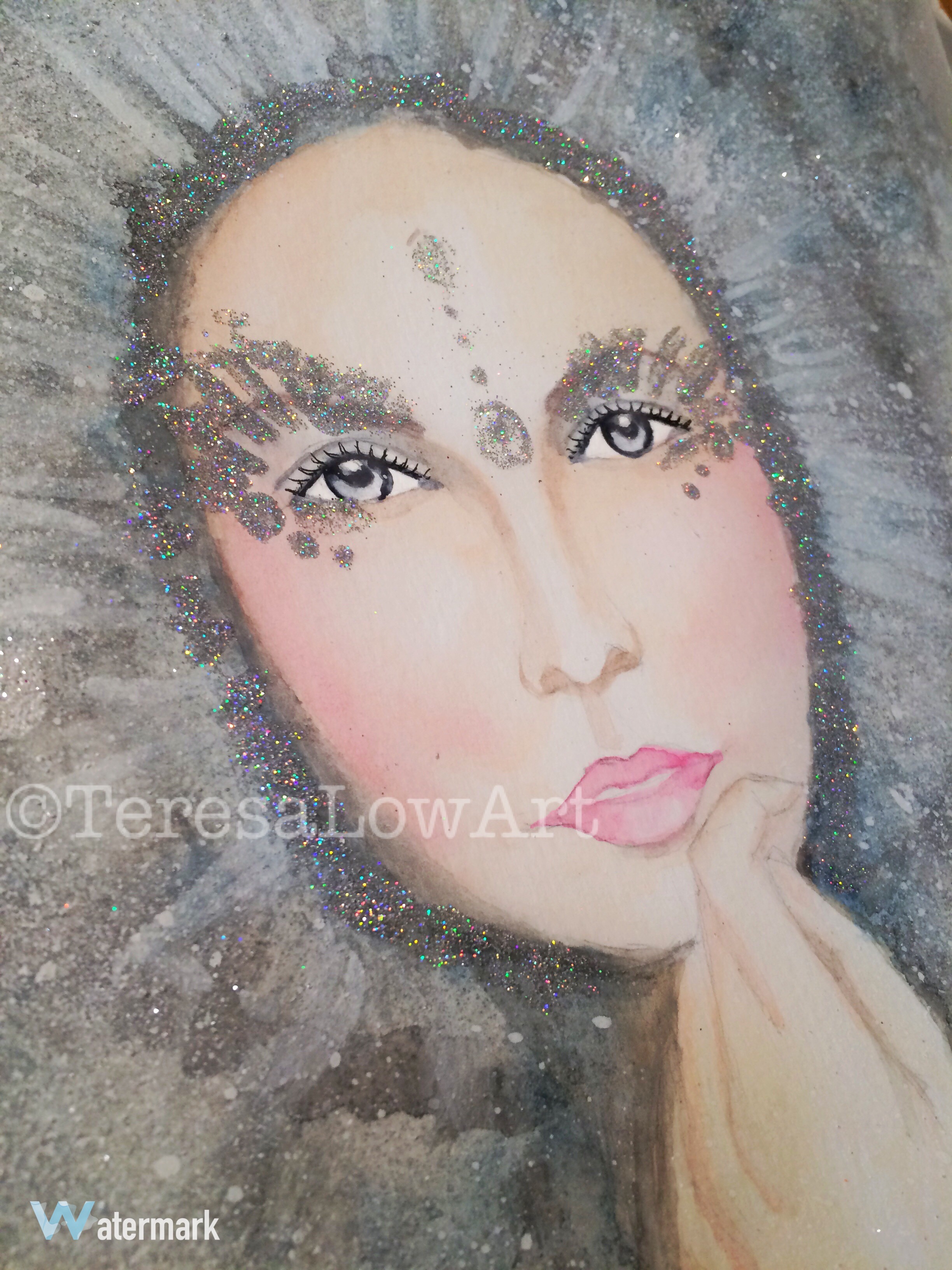 Loved painting her. Watercolor with salt, splatters of acrylic paint, and loads of glitter. Wish you can see the glitter up close. It sparkles and twinkles in the light. Glitter makes me happy and I definitely glitterized her!😂😂😂 this is one of my favorite paintings…