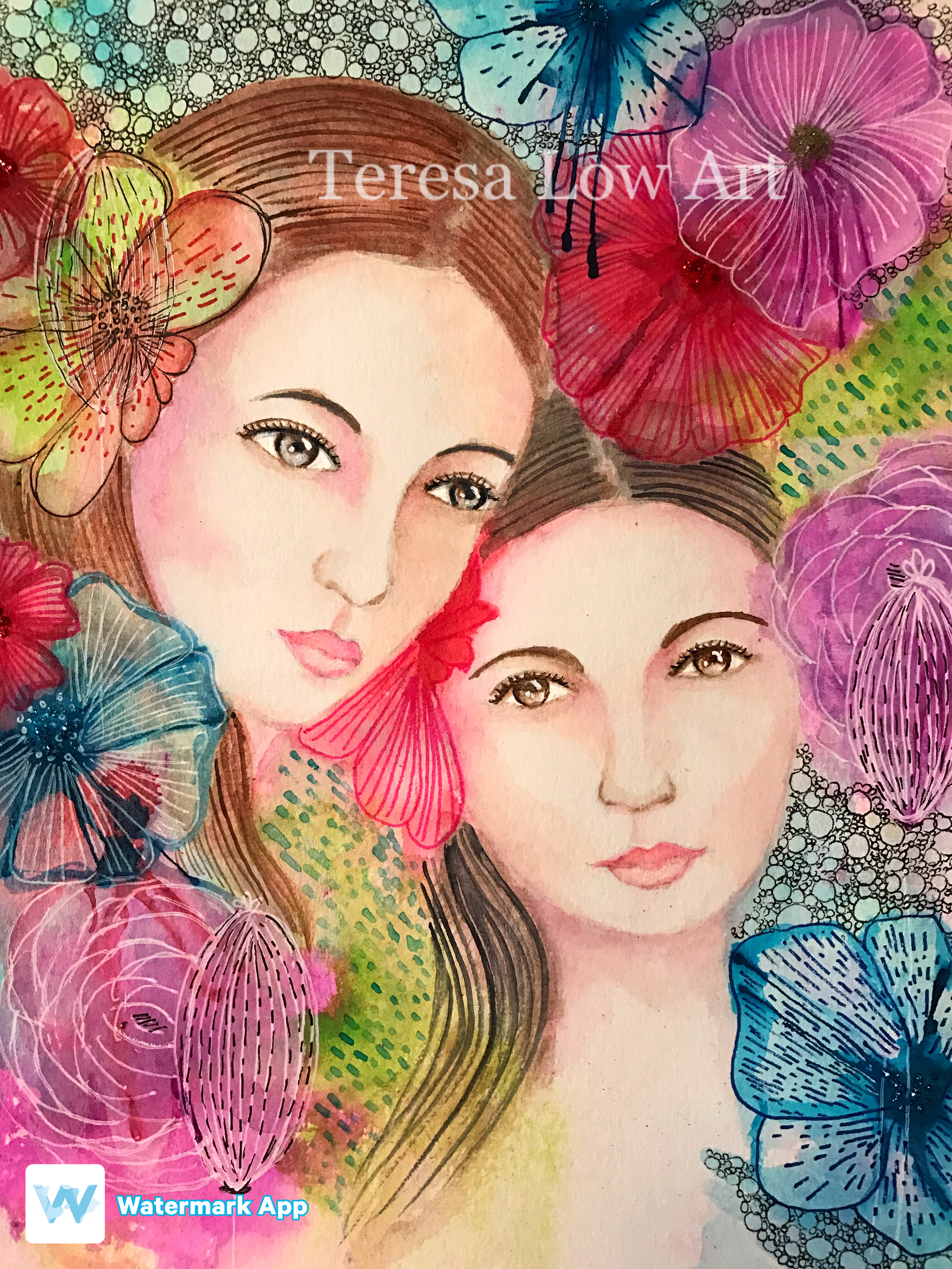 “Flowers and gratitude”. I was away at a swim meet this weekend. And if any of you are swim parents, you would know that there is a lot of sitting and waiting. Luckily I brought a goodie bag along with watercolor, markers and was able to finish this piece. I started with my favorite part, the faces, first, then added the flowers and left the doodling for the last. This piece is inspired by a lesson from Life Book 2017, taught by the wonderful Tamara Laporte. Check her out!
