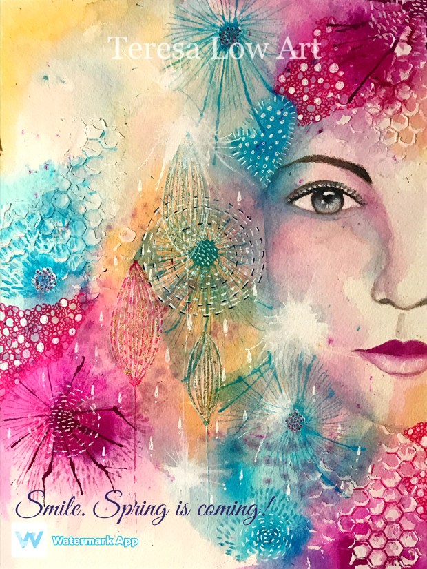 A mixed media piece with acrylic painting, pastels, stencils with molding paste, markers and collage. Love mixed media.