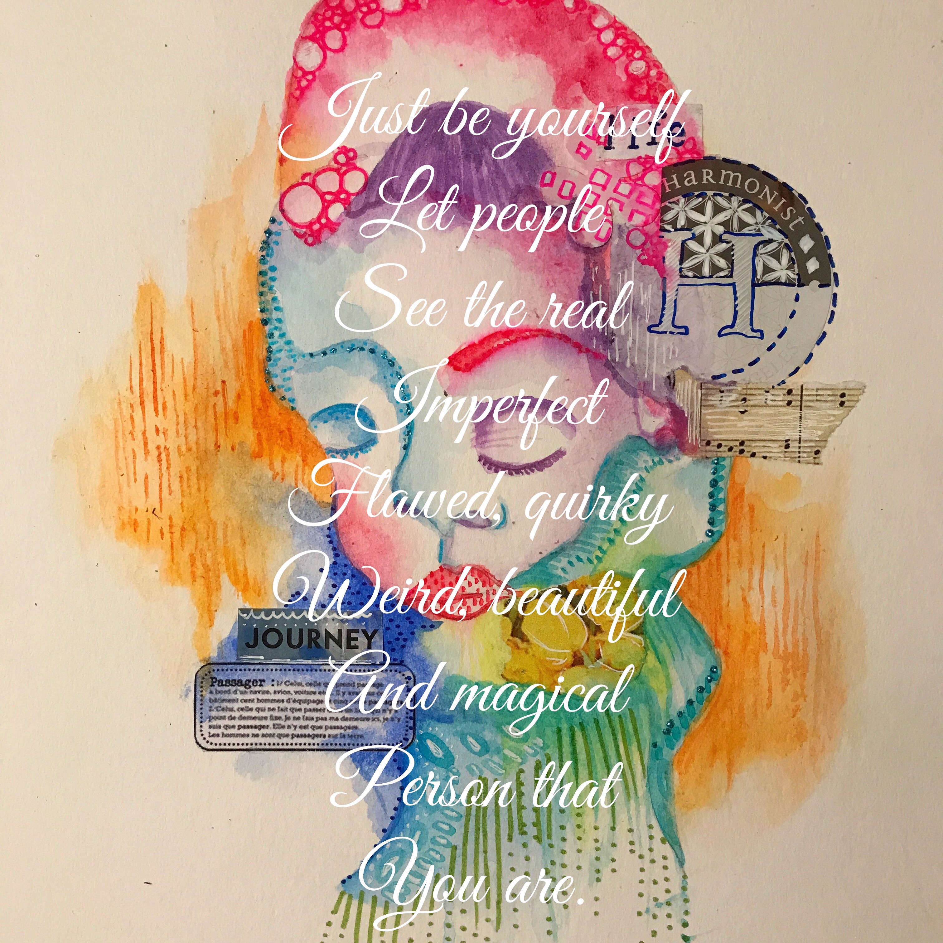 I really enjoyed playing with watercolor and collage here. So, just be yourself. The flawed, quirky and magical you❤️❤️❤️