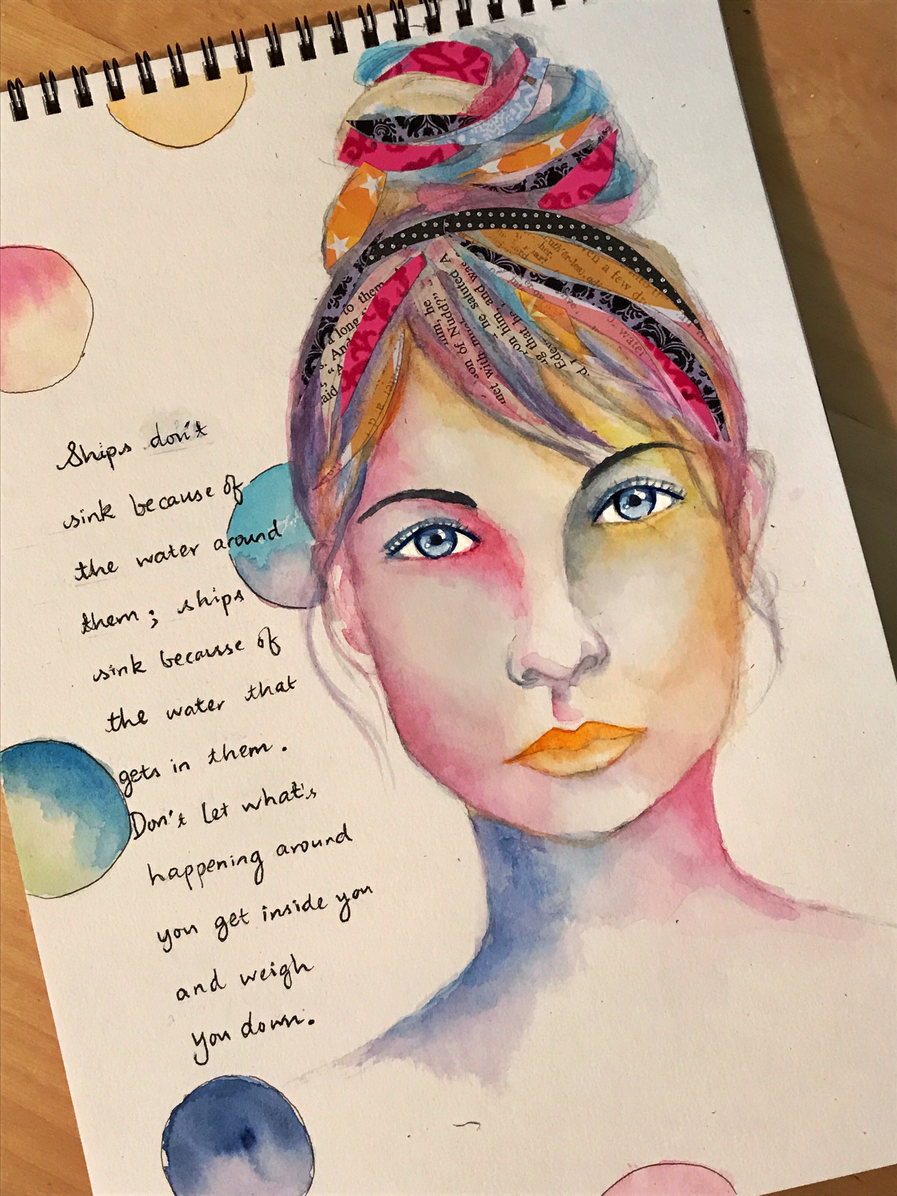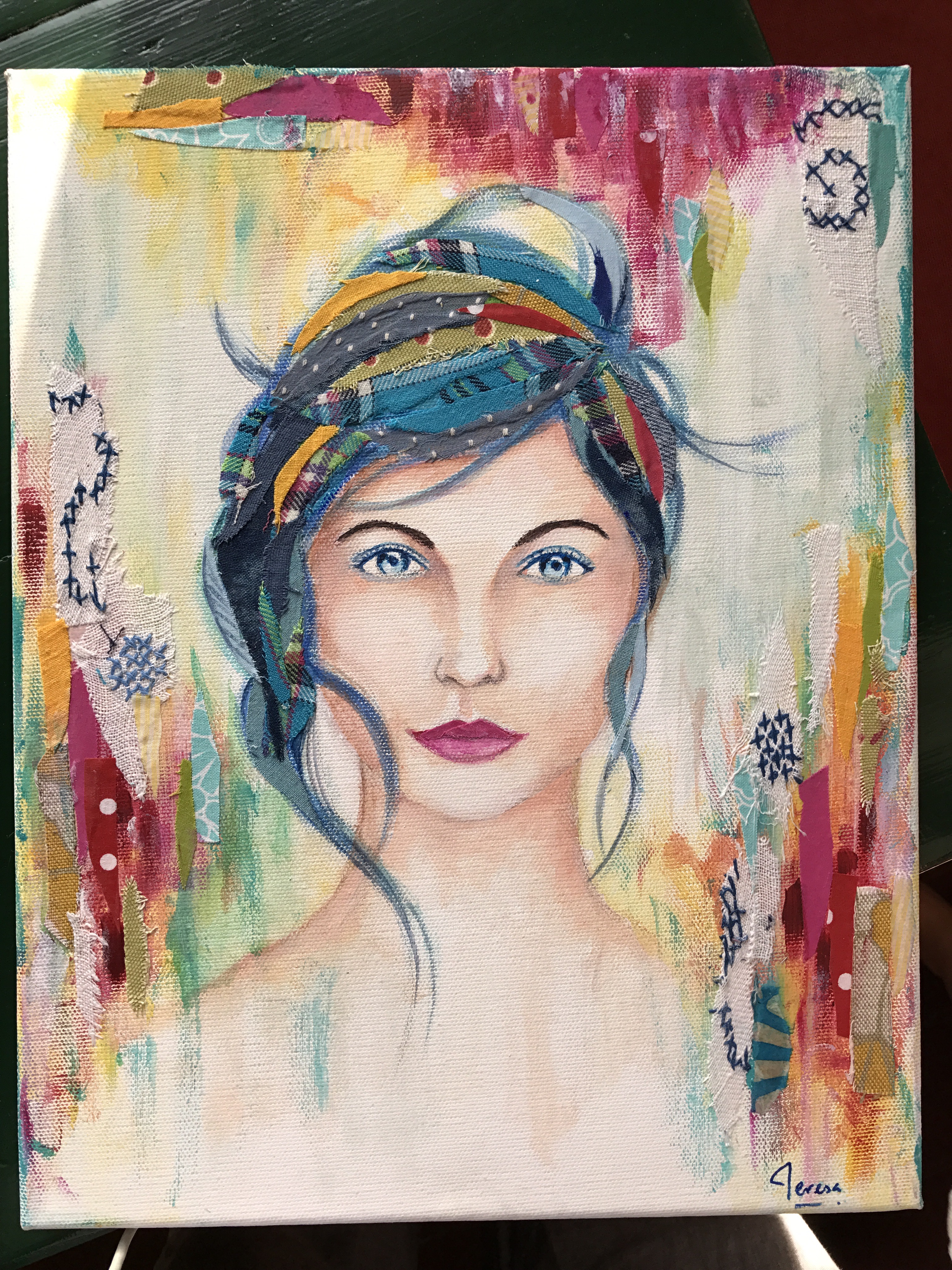 While I wished I could paint landscapes, I knew my heart just wasn’t in it. So I listened to my heart and decided to paint what I love most instead. A face. This is what I painted and I love her. I think she was inspired by all the beautiful creative goddesses I have met at Squam. The fabric really added something interesting to the painting. I approached it like mixed media, using fabric as another media. I love this new technique and will be using it more.