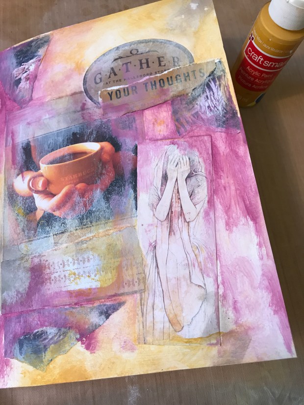 First find and glue images on my page. No rhyme or reason why I picked them. Just like how they look together. Then gesso over to prime the page.