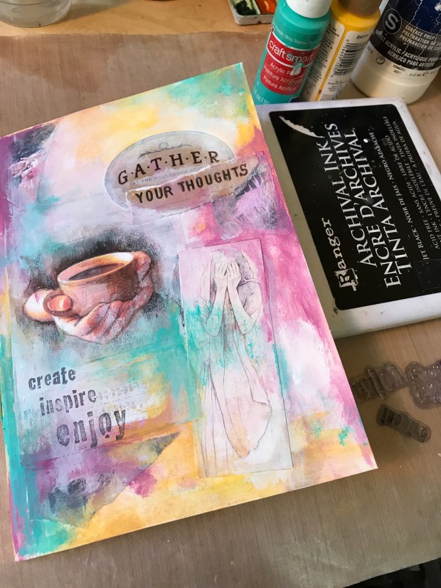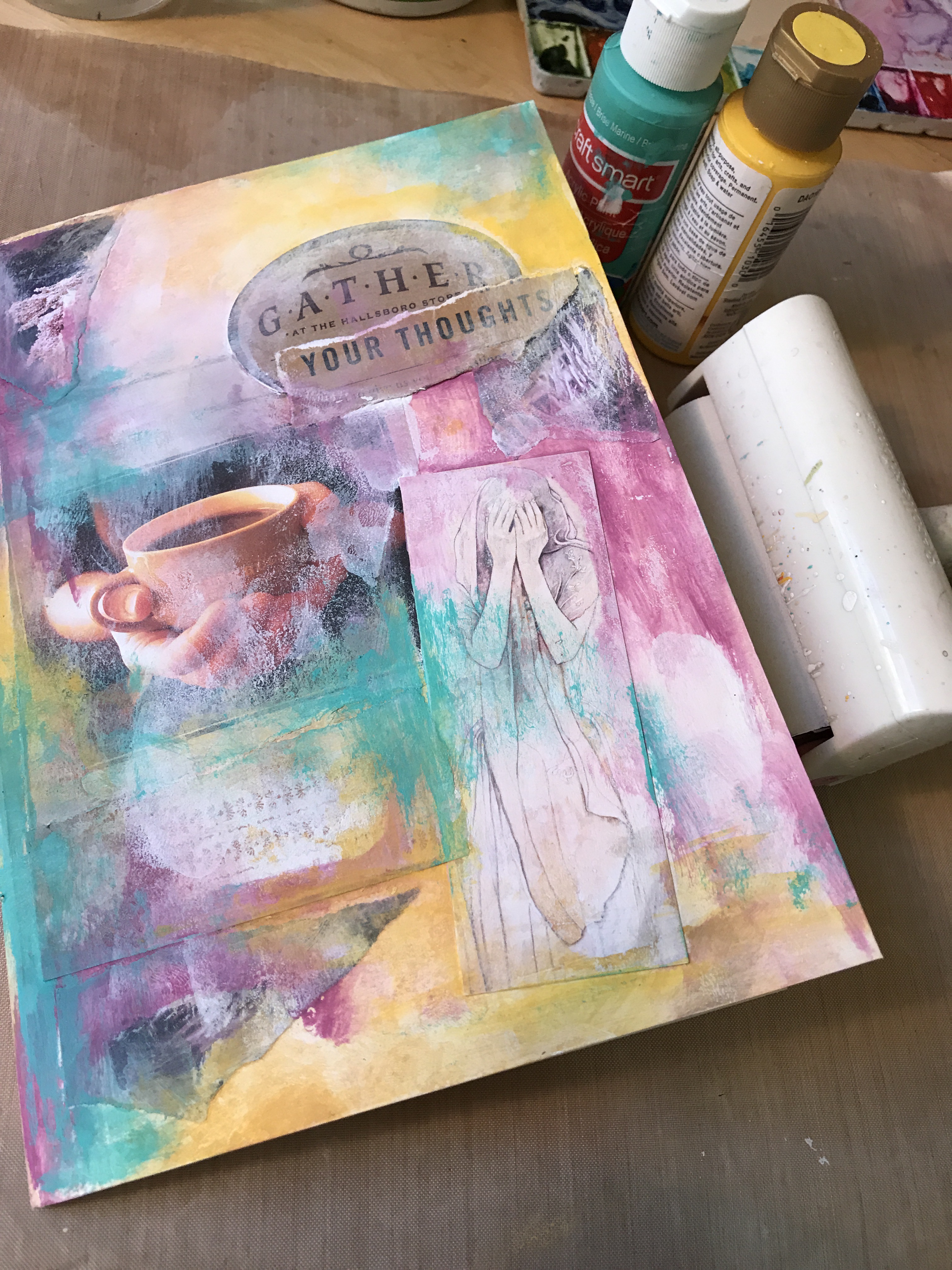 Time to add some colors using acrylic paint and distress ink pad. I also love to add gesso to tie the page together.