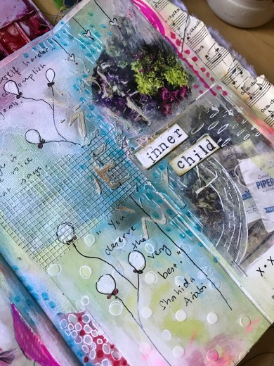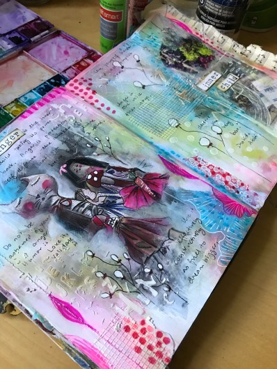 Inspired by the picture of these rag dolls I saw in a magazine. Created a mixed media piece in my alteredbook and added journaling in it. Acrylic paint, stencil with molding paste, doodle, marker pens.
