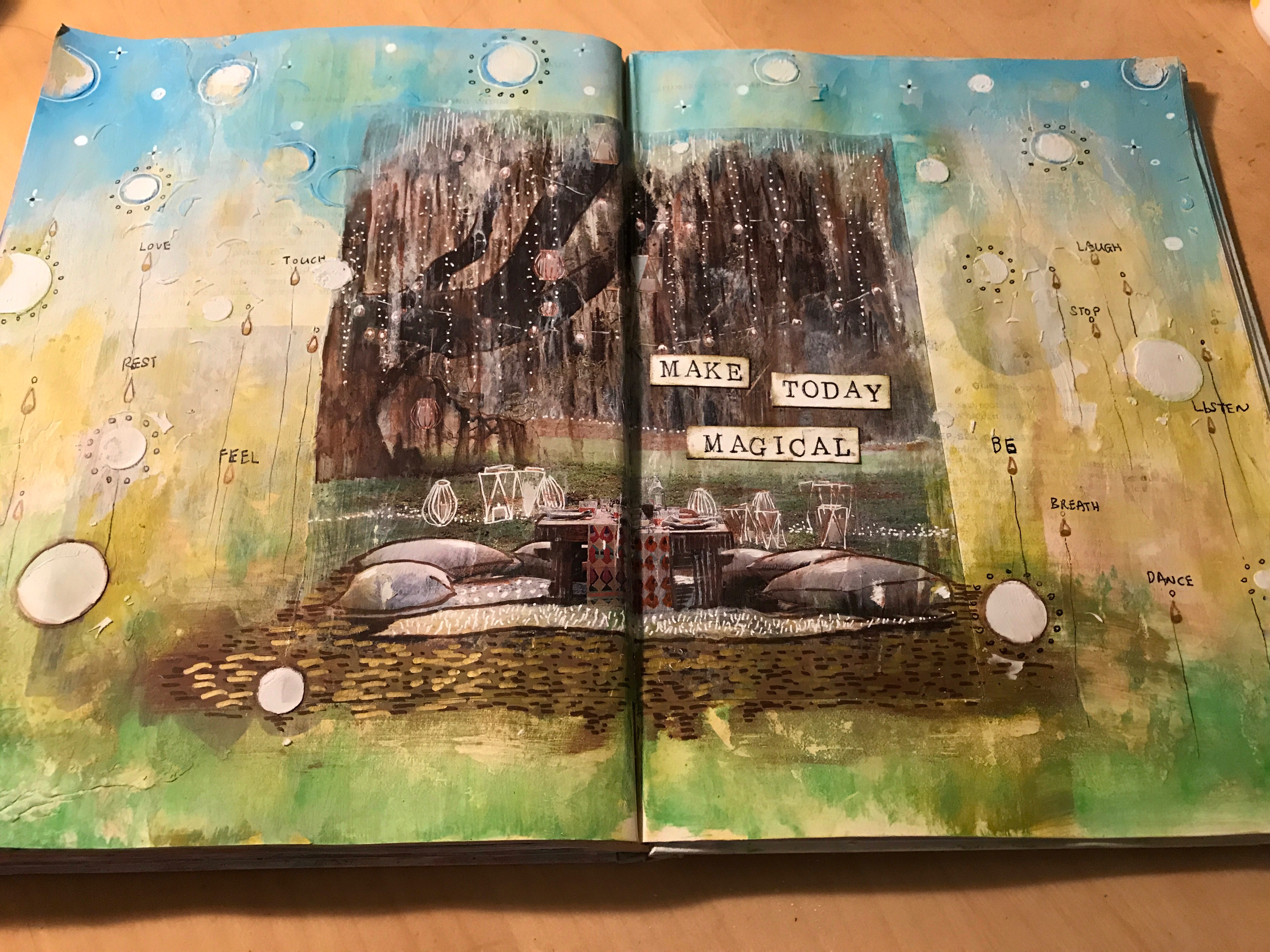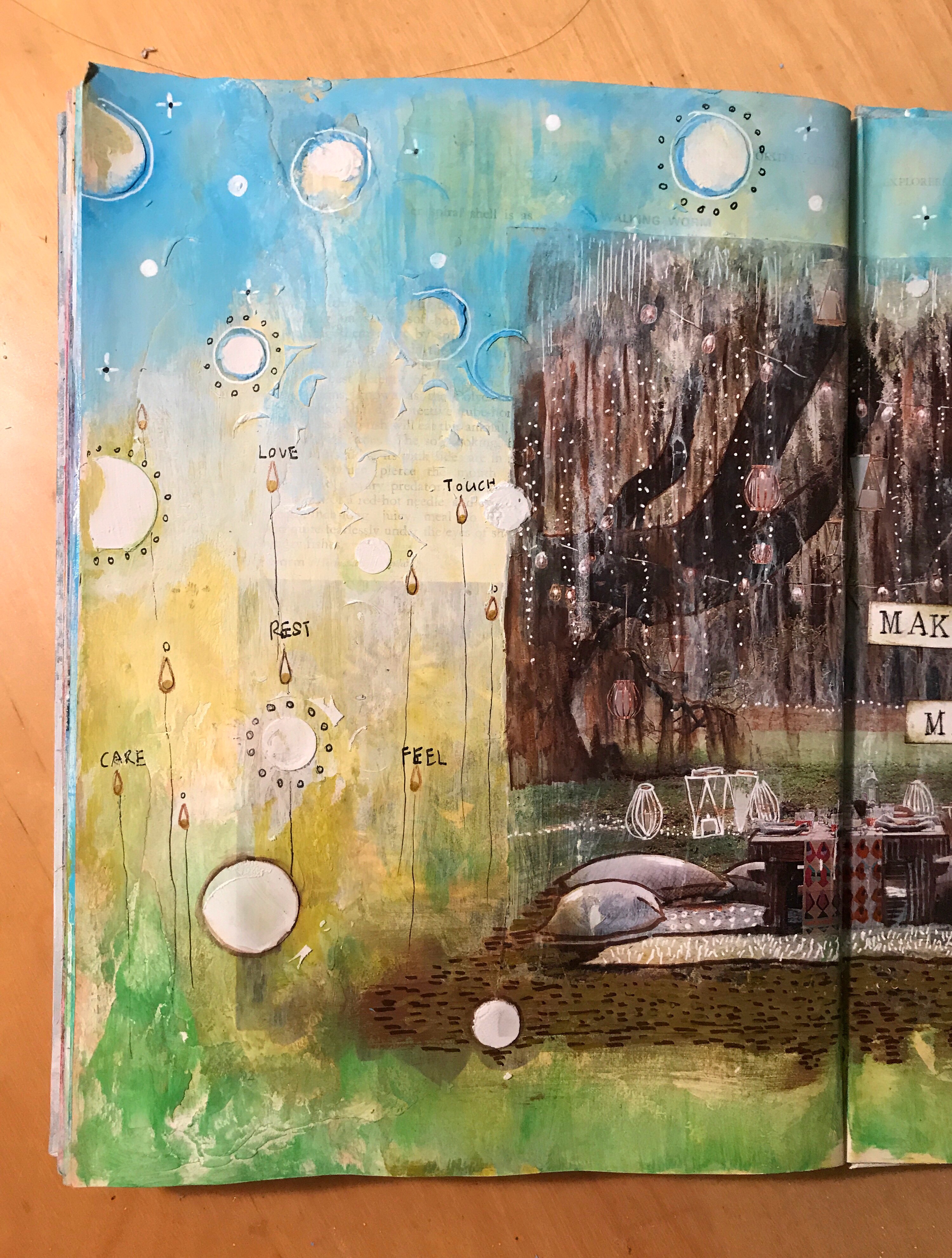 Mixed media page with collage, modeling paste and stencil, acrylic paint, doodle with markers and gel pens.