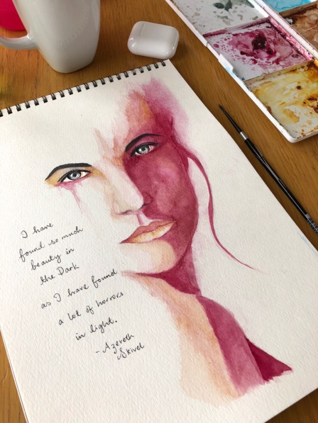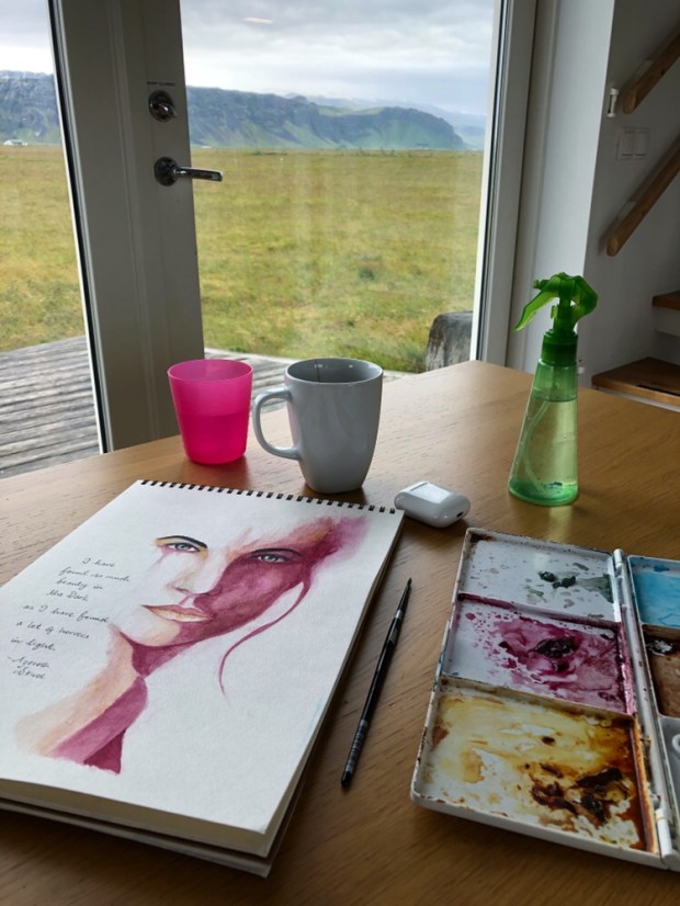 Sometimes i find it hard to do art when I am traveling. Tend to take a lot of photographs instead. Advantage of traveling with 2 teenagers is that they like to sleep in. Which gives me the quiet time in the am to do some art. I was able to finish up a piece I started before we came to Iceland. Added more contrast and a quote to it. Viola. Done.Watercolor and ink for quote.