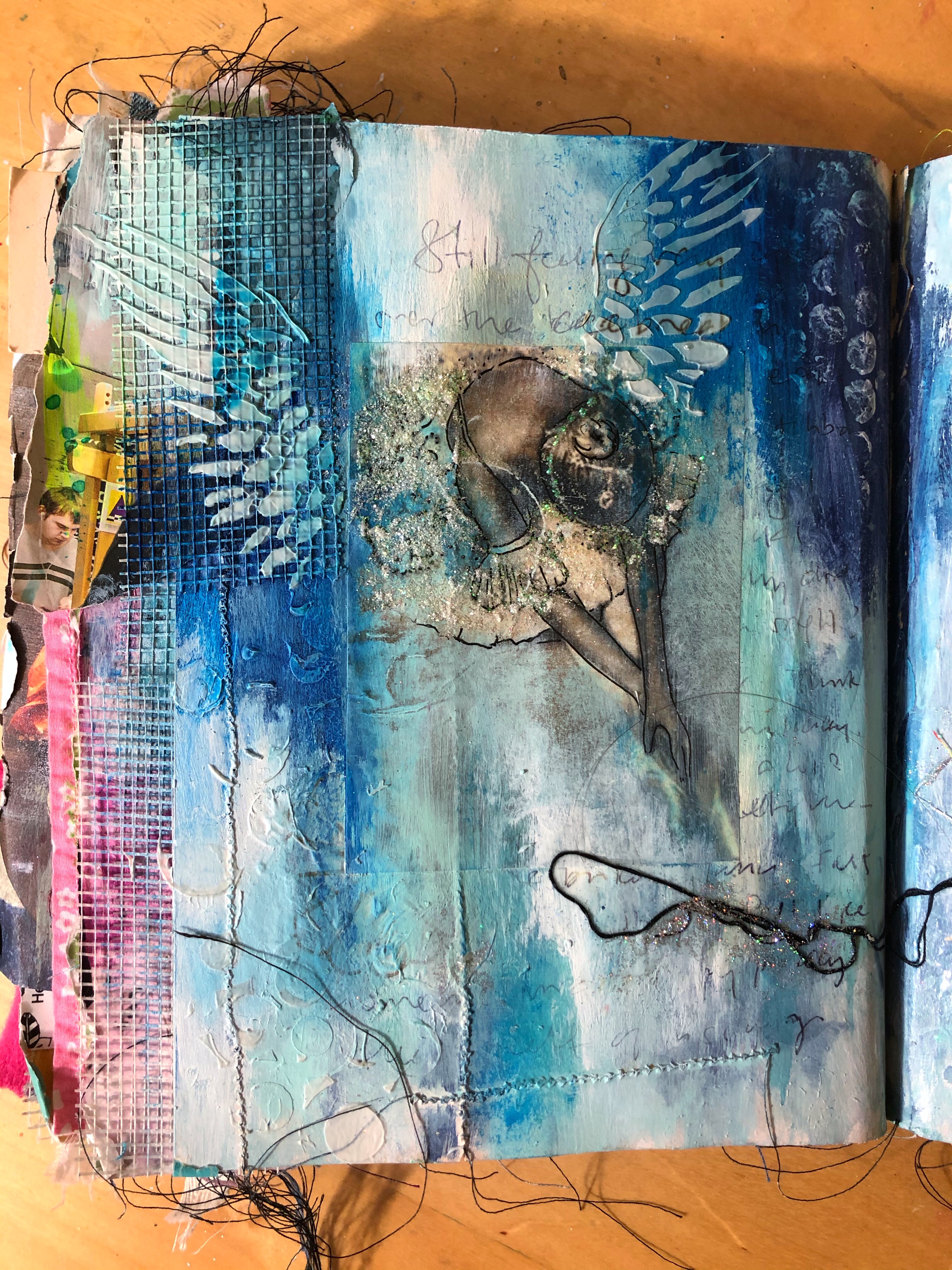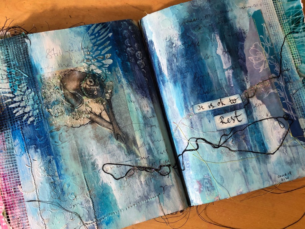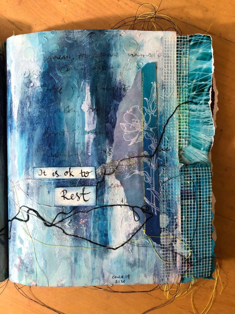 A few weeks ago, I created this page in my altered journal. I did not know where I was going with this page, so I left the other side alone. I know that one day it will come to me. And it did. I added some messy threads to the page and some words to remind that I need to give myself permission to rest. Especially in times of crisis. I tend to jump into action, keep myself very busy, as a way to deal with the stress. To avoid thinking. It is not healthy. Yes. It is ok to rest.