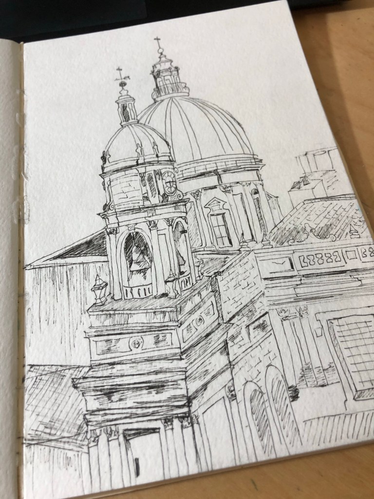 Catania Sicily. 2018. I remembered climbing up the dome just in time to enjoy the gorgeous sunset. Truly beautiful up there. And I am loving this new form of art. Had no idea I would enjoy drawing all the details in a building. I find it therapeutic and relaxing. And I get to really appreciate the details that I missed the first time around. And I get to choose whatever color I want!!!!