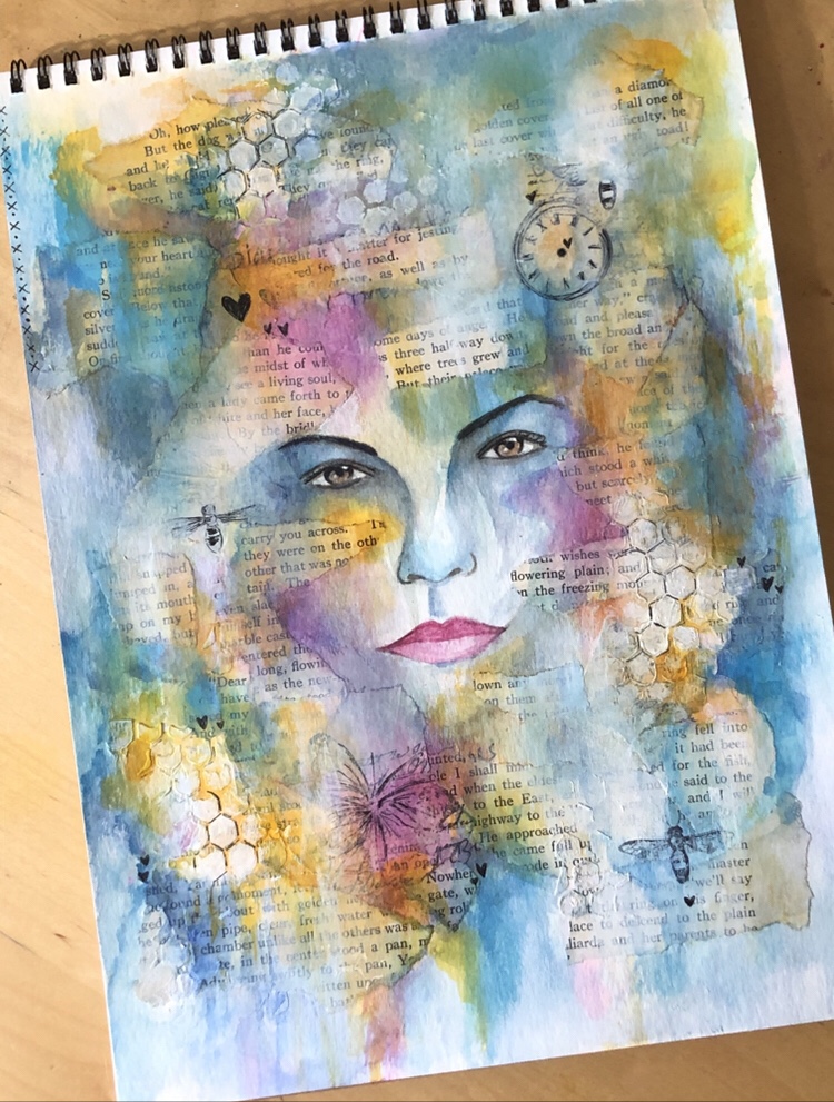 Then more paint, stamping, stenciling… softening the overall piece and she is finally at peace. So am I…