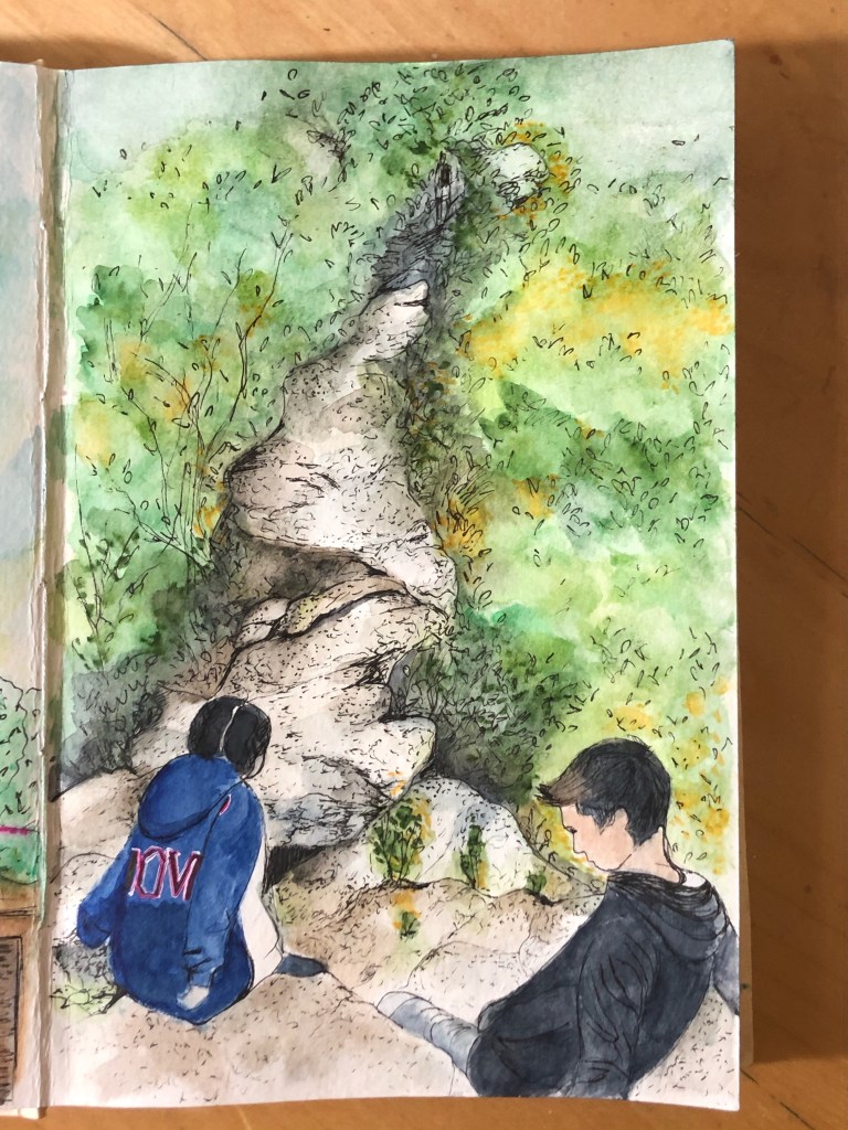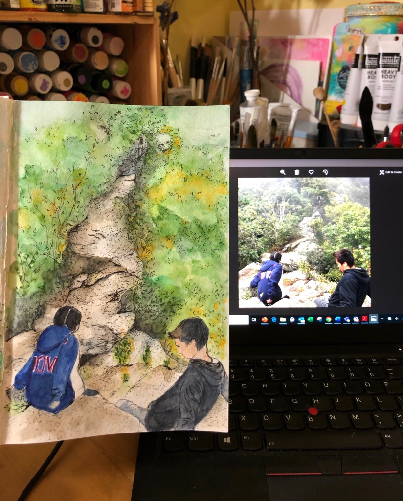 I remember this day so clearly. One of the rare times when I convinced my kids that going outside for a hike would be a fun thing to do! We heard old rag mountain (Shenandoah National park) is cool so we did it! With no idea what the hike would entail 👀 this was the part of the hike when I was sure one of us would fall to our deaths and also when it became abundantly clear that I am officially the old lady in the family. They all looked after me and made sure I got to the other side in one piece. How the roles have flipped.. my kids are now the ones taking care of me.. hmmm… guess I will just enjoy and embrace it! Sketching my way down memory lane…