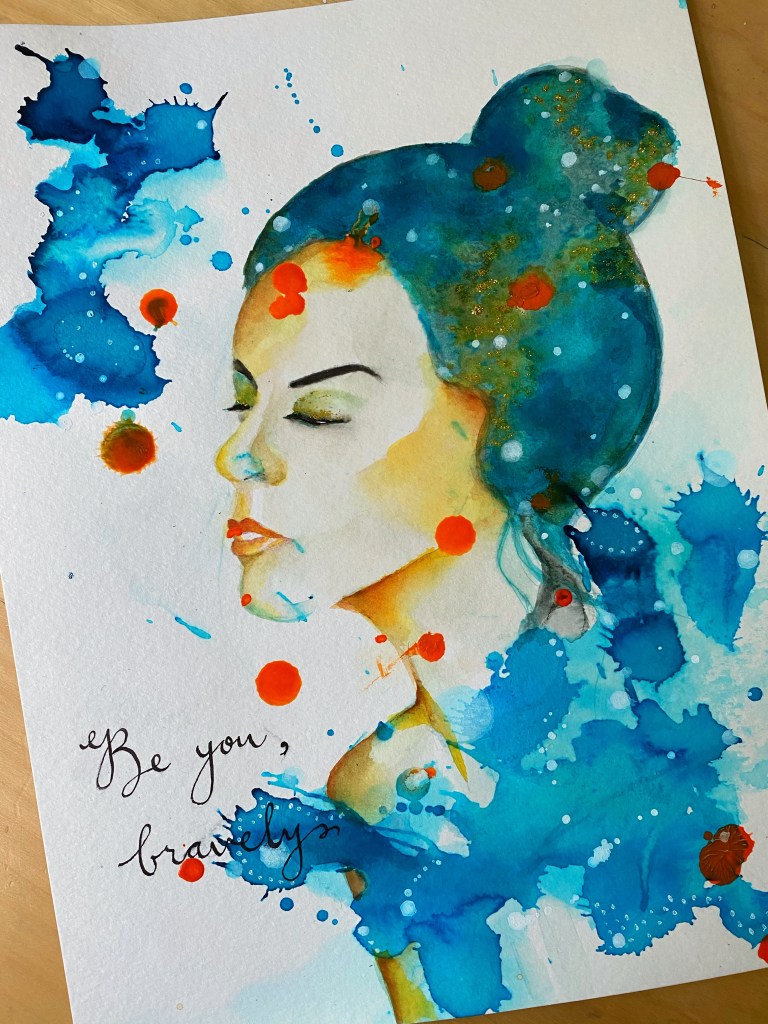 Three simple words. Not simple to do. I wonder if I truly know who I really am. We are molded by our experiences, the society we live in, the jobs we hold, the roles we play. When you are stripped of all that, do you know who you truly are? And have the courage to be that? Bravely and proudly. No apologies. Just accepting the beautiful unique you that you are… mixed media piece.