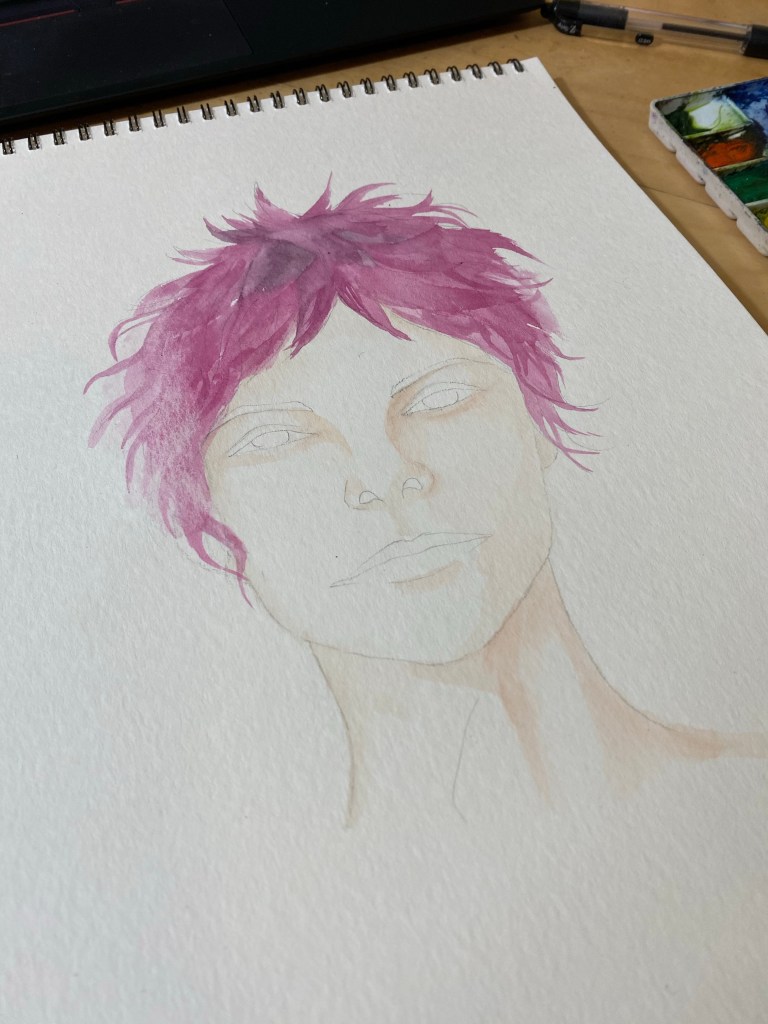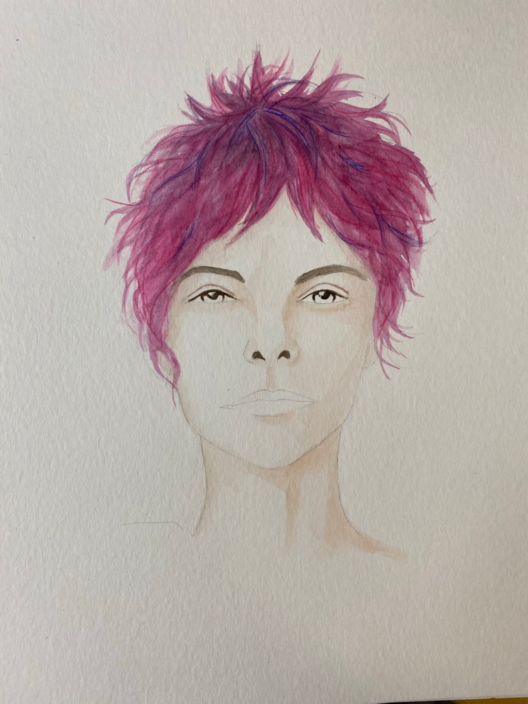 Stage 1. Inspired by a reference photo on Pinterest. The crazy spiky hair. So I draw it out and think, oh this looks good! Let’s paint!