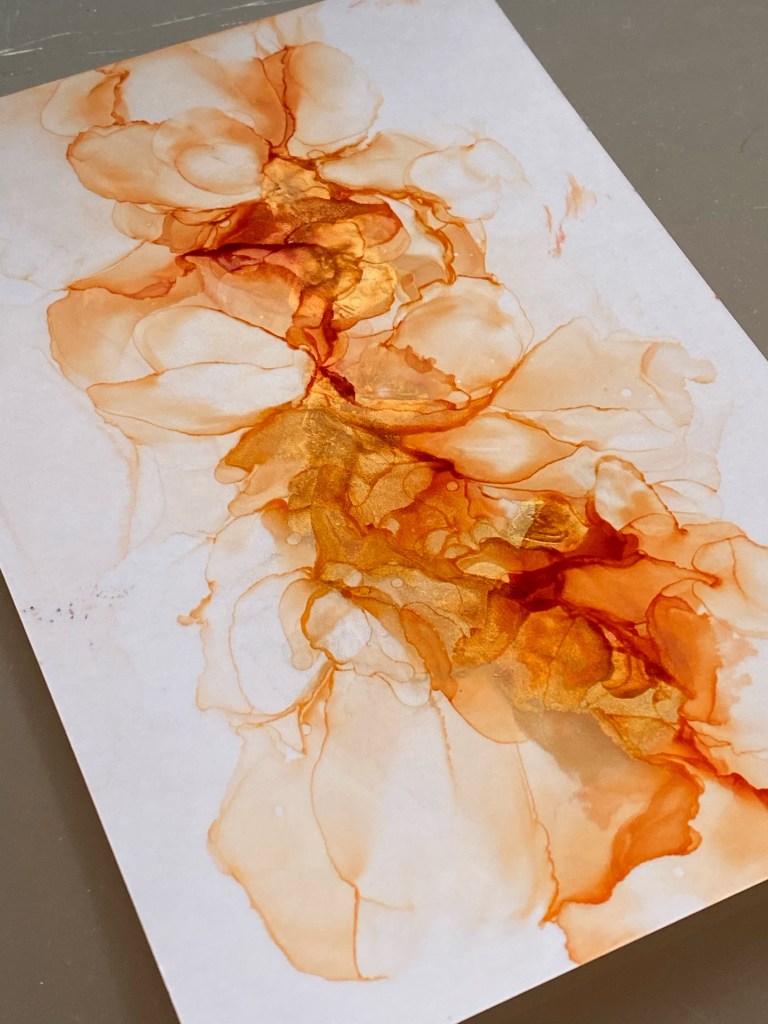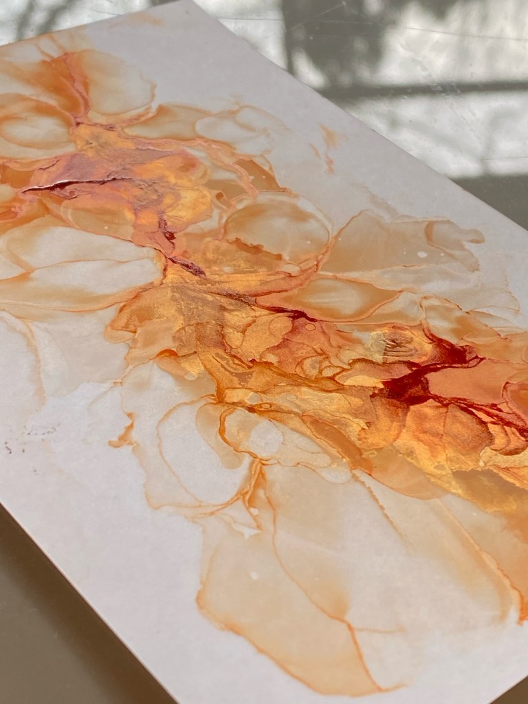 I love discovering colors through alcohol ink play. And sometimes I would accidentally come across a beautiful color combination, like what I did today. Not my usual but a pleasant surprise. Orange and gold.
