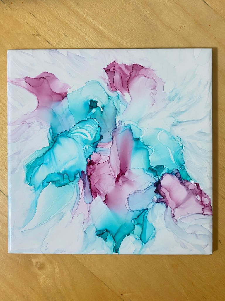 So, to people who are not familiar with alcohol ink art, there are many good videos on YouTube you can check out. I used alcohol ink from Tim Holtz and the highest percentage Isopropyl Alcohol I got from CVS. You will need at least 91% to get that beautiful flow. You need to paint on non porous surface like yupo paper. Those can be expensive. So I paint on tiles from Home Depot. They are cheap and easy to clean. I reuse them. That way I don’t get too precious about what I made and feel free to experiment and make mistakes. Although I have to say I love this piece. May just keep it…